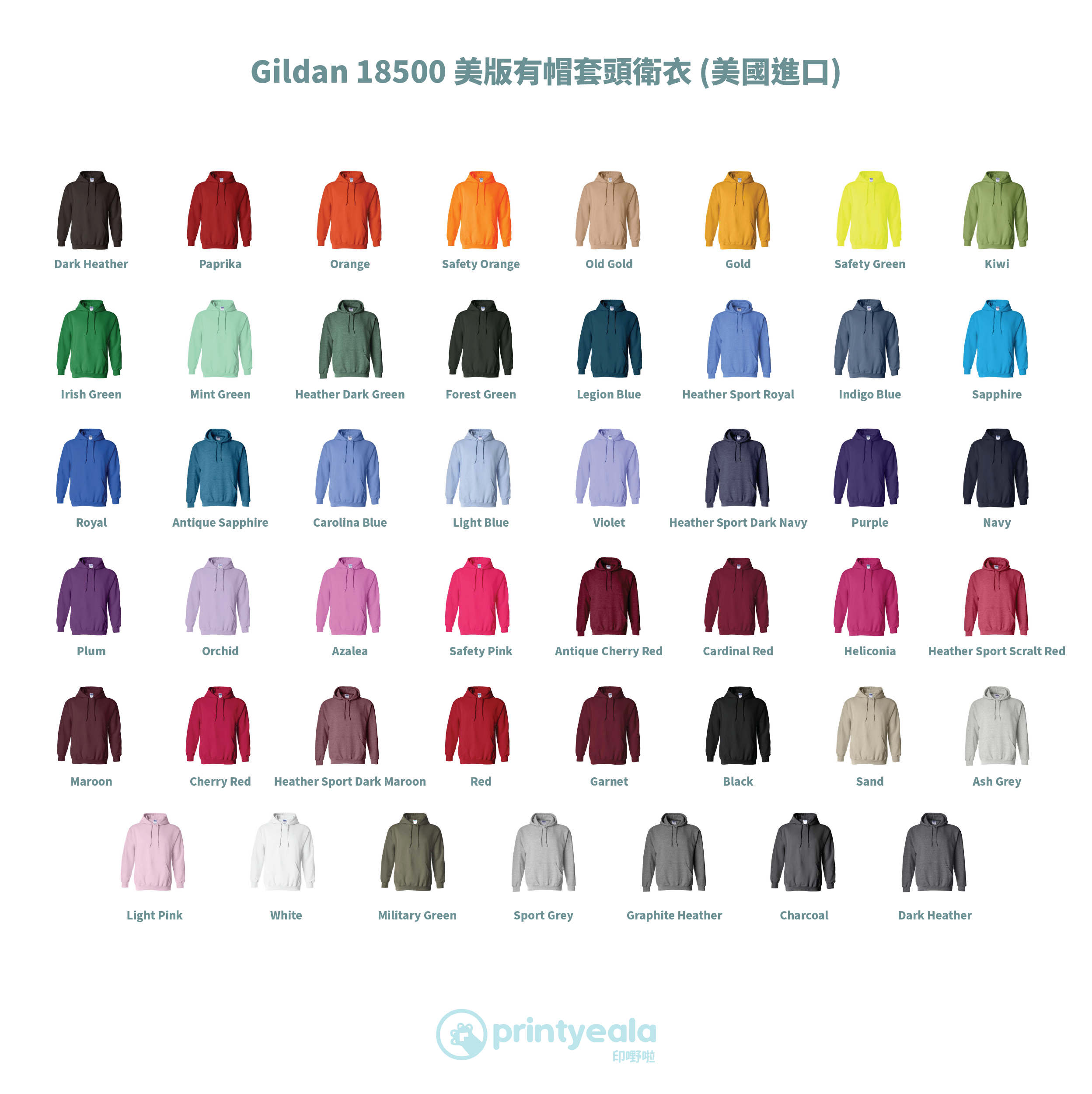 *Gildan 18500 美版有帽套頭衛衣 (美國進口)的產地為美洲國家,例如:洪都拉斯、海地、多明尼加等等。按批次而定,隨機配貨。